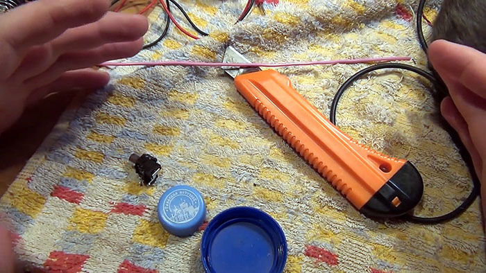 Затем, на небольших проводах подпаиваем гнездо. В крышке канцелярским ножом сделаем надрезы под плечи вибраторов.