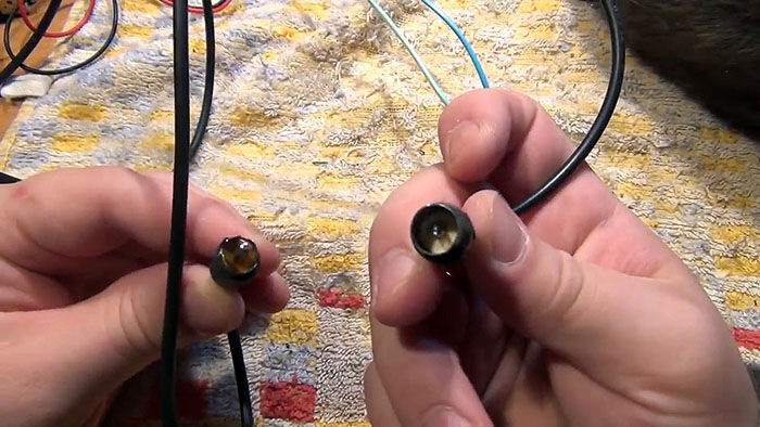 Во второй крышке сверлим отверстие под гнездо и также горячим клеем вклеиваем его. Соединяем крышки и спаиваем их паяльником, чтобы было одно целое. Антенна готова.