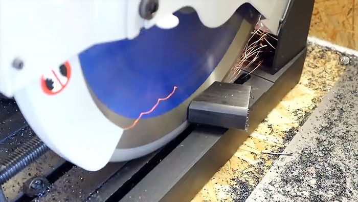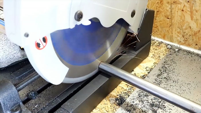 Начнем работу с основного узла, который будет воспринимать вес автомобиля, и через колеса передавать его на землю. Для этого с помощью маятниковой пилы отрезаем кусок стальной круглой трубы и точно такой же по длине отрезок профильной трубы.