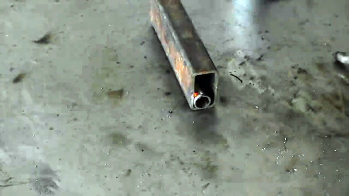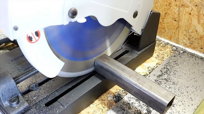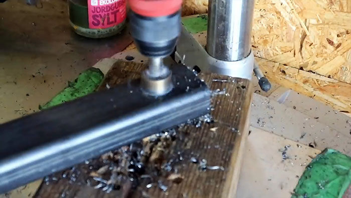 Отмеряем и по разметке отрезаем еще одну расчетную длину профильной трубы. С одного конца на станке сверлильной головкой выполняем сквозное отверстие.