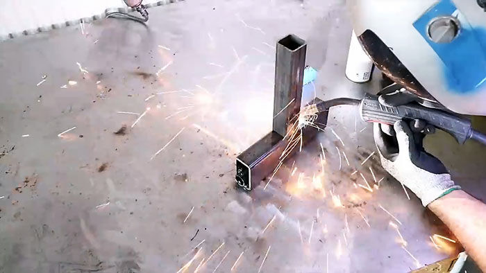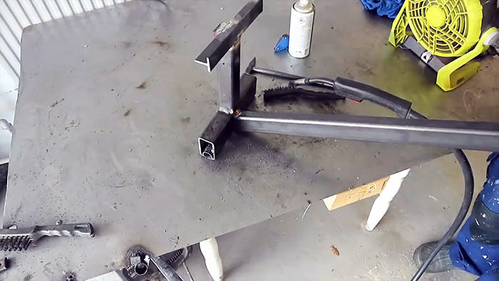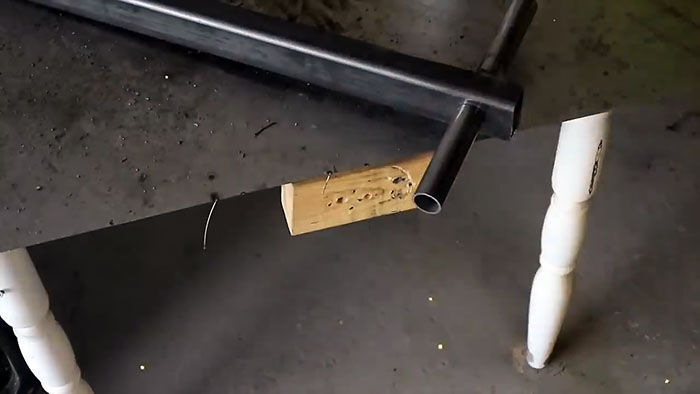 Отрезаем еще один кусок профильной трубы и привариваем его вертикально в центре горизонтального узла, состоящего из профильной и круглой трубы.