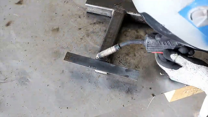 Сбоку к горизонтальной профильной трубе под вертикальным элементом под углом привариваем ручку-рычаг.