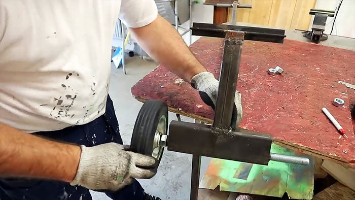 На оба конца навинчиваем до упора по гайке, затем устанавливаем бескамерные колеса и затягиваем их двумя другими гайками. Наш самодельный подъемник готов к работе.