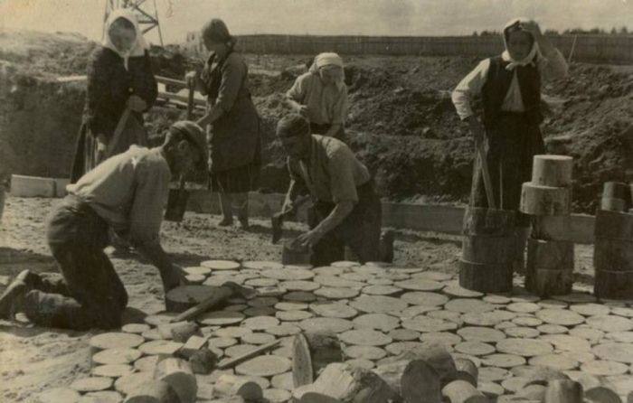 Еще одним важным достоинством новых мостовых было то, что материал для них доставался достаточно легко. Чаще всего использовали болванки из сосны (они меньше всего раскалываются). Деревянные торцы устанавливались в землю, а промежутки между ними заливались битумом и смесью вара с антраценовым маслом. По краям мостовая заделывалась глиной и смолой. Служила такая конструкция 3-4 года.