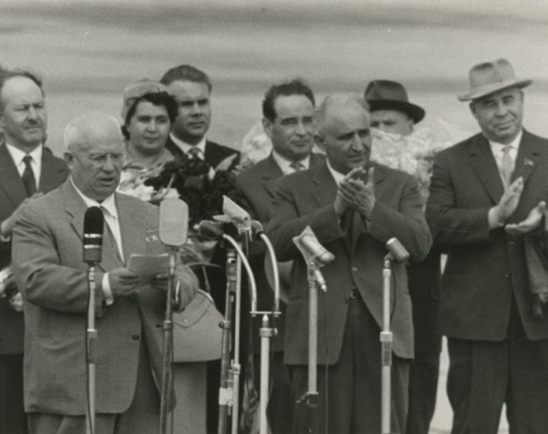 Н. С. Хрущёв (выступает), Т. Живков и П. Шелест на митинге во время визита в Болгарию (октябрь, 1964 год).
