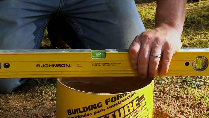 Ставим в яму на гравийную подушку, ранее отрезанную тубу, и проверяем вертикальность ее установки с помощью строительного уровня.
