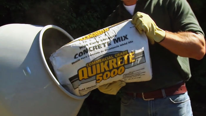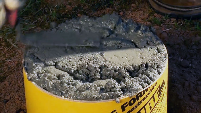 Замешиваем вручную или в бетономешалке раствор и после окончания перемешивания заполняем им форму, регулярно протыкая бетонную массу штырем из арматуры и мастерком, чтобы не допустить оставления в толще смеси воздушных пузырей, что плохо скажется на несущей способности столбчатой опоры.