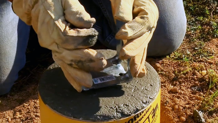 Заполнив бетонной смесью форму до самого верха, разравниваем поверхность и точно по центру устанавливаем закладную.