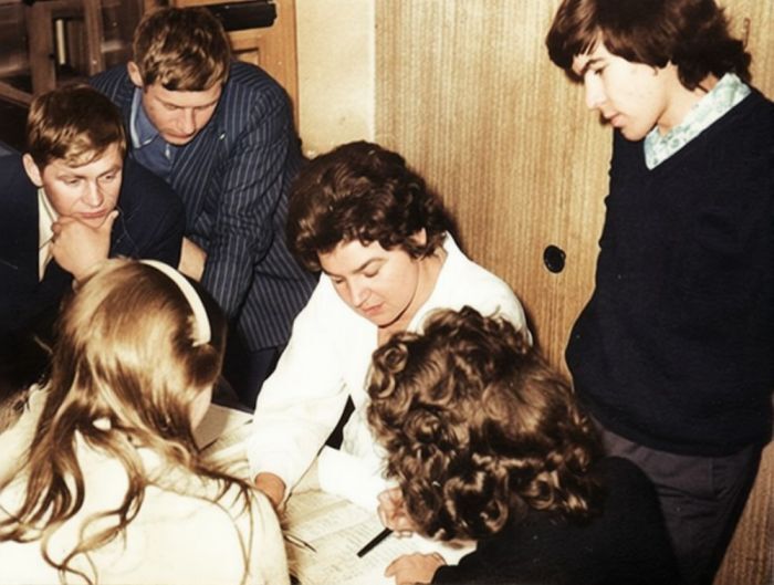 На этой фотографии обращает на себя внимание, с каким заинтересованным вниманием слушают её студенты. О чём она им говорит — о своём предмете, химии, или об общественных делах?