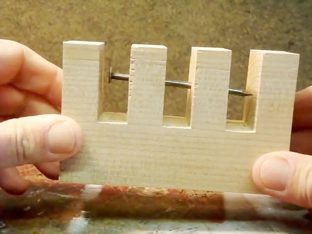 Понадобится деревянный прямоугольный брусок примерно на 20 процентов длиннее гвоздя. Этот брусок по широкой стороне должен быть параллелен волокнам дерева, то есть при распилке смотрите заранее.