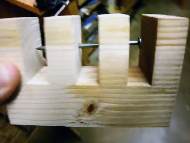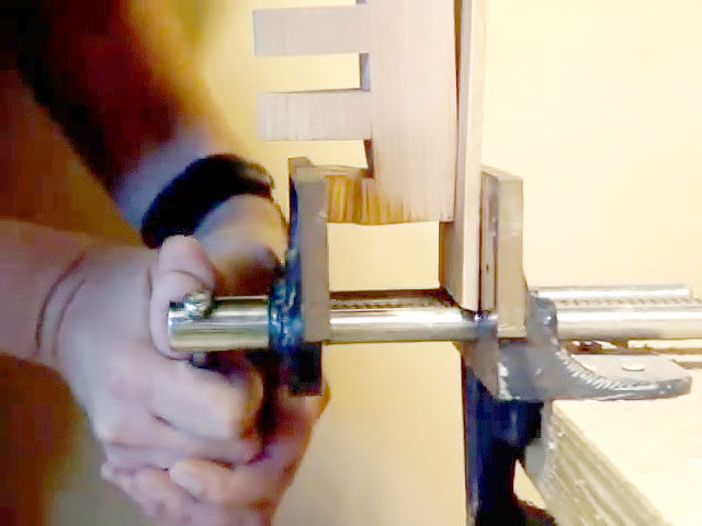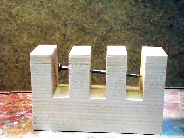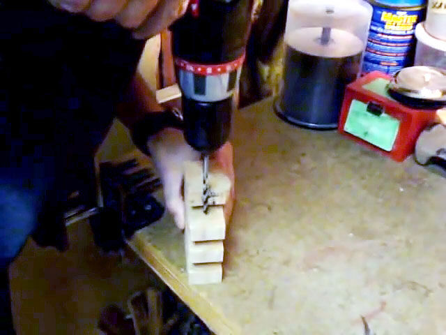 Даем высохнуть бруску и через два дня снимаем его с тисков. Сверлим отверстие под гвоздь, потому что так его не забить - дерево лопнет.