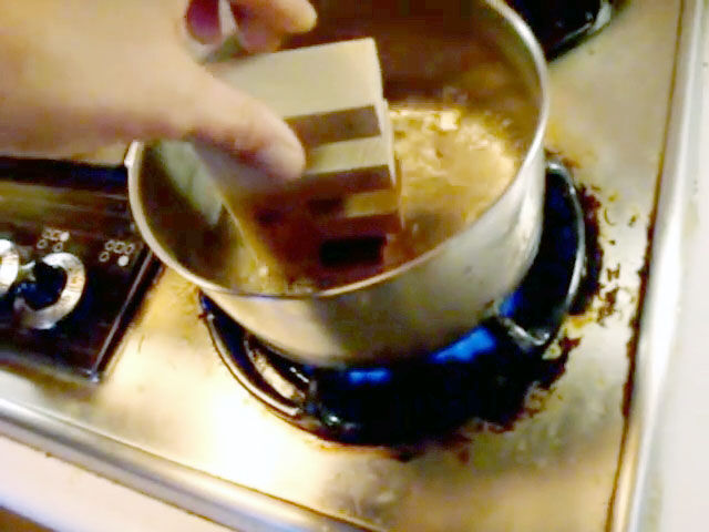 Вот добрались мы и до секрета. В кастрюлю наливаем воды на два пальца. Включаем огонь и ждем пока закипит. Распиленный брусок одной стороной кладем в кипящую воду и кипятим его примерно 5-10 минут.