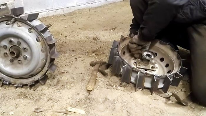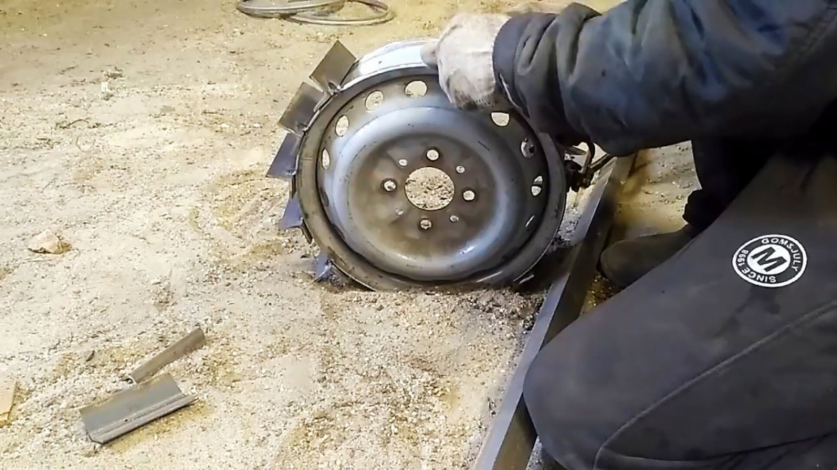 В идеале использовать штампованные диски от любого старого автомобиля ВАЗ. Их крепежные отверстия обычно совпадают с отверстиями на пластине вала фрезы большинства китайских мотоблоков. Благодаря этому можно будет использовать полуось от фрезы как ступицу, закрепляя грунтозацепы на редукторе.