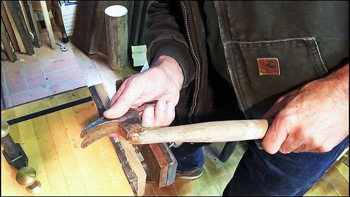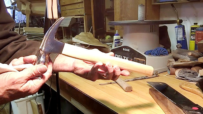 В процессе придаем желаемую форму под руку для удобного хвата. Не забывайте периодически примерять молоток к рукояти, чтобы не срезать больше необходимого.
