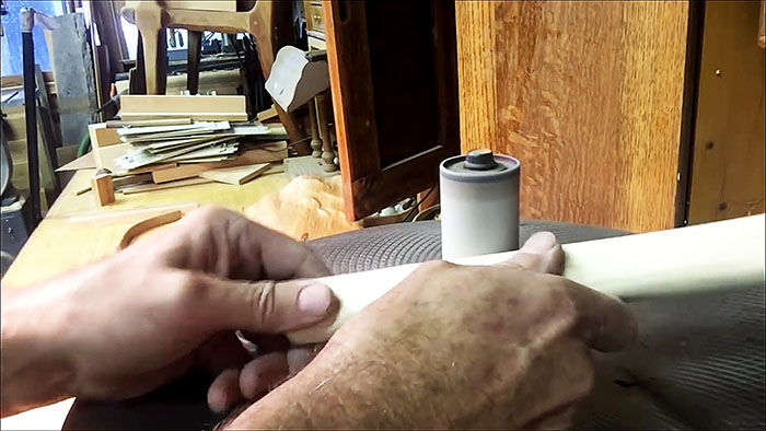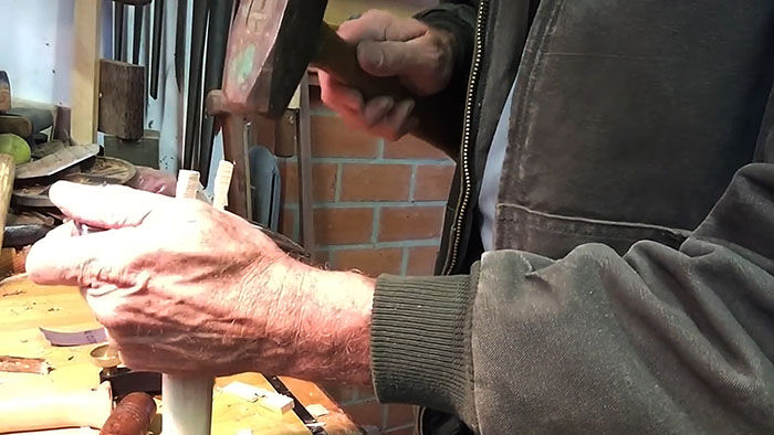 Отверстие в нем должно быть чуть меньше получившейся заготовки. Мы пользуемся скобелями различных размеров, так намного удобнее. При их отсутствии можно воспользоваться обычным рубанком. Когда обработка окончена, делаем пропил в торце для дальнейшего расклинивания.