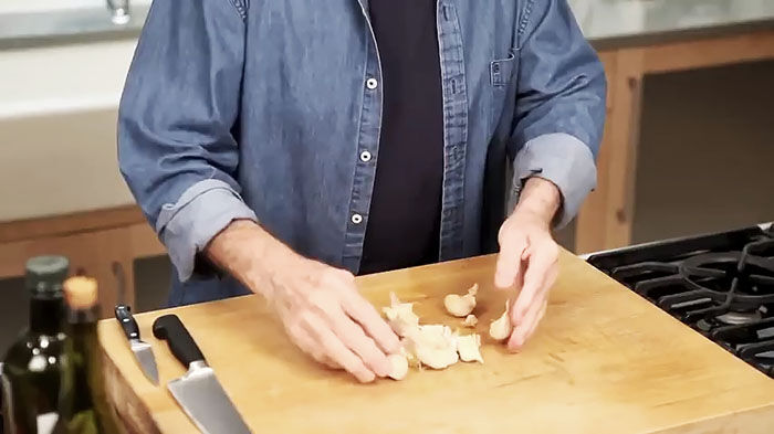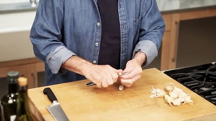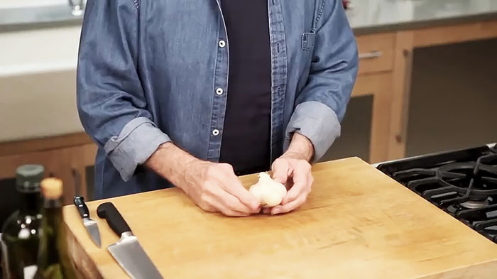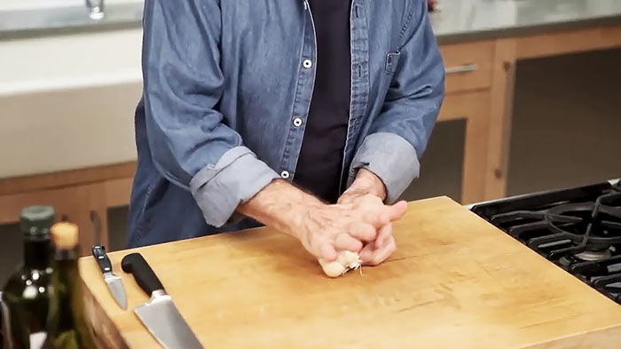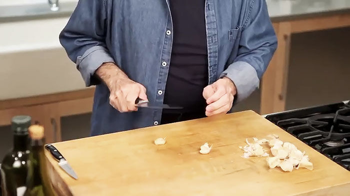 Маленьким ножом сделайте надрез по периметру конца зубчика, положите его на доску и ударьте боковой поверхностью лезвия ножа.