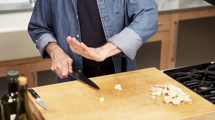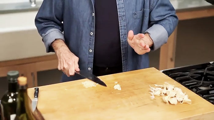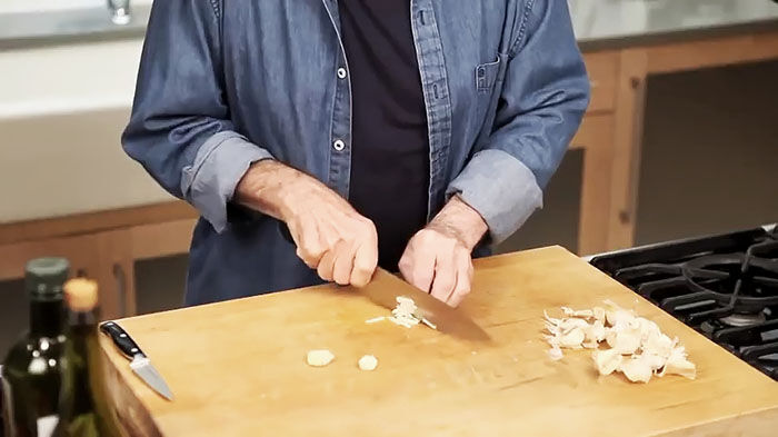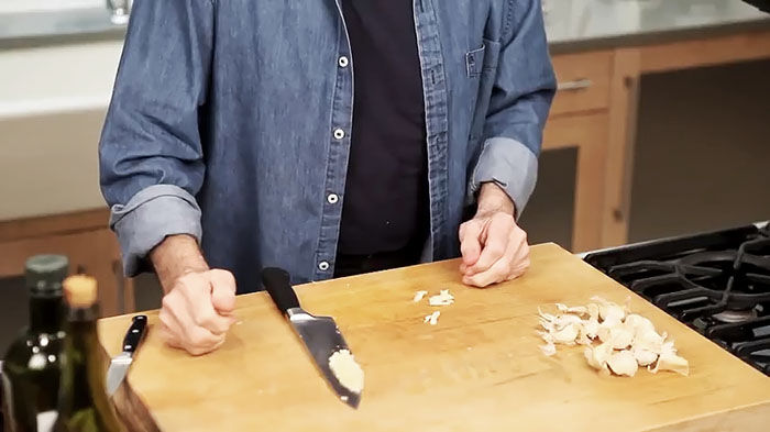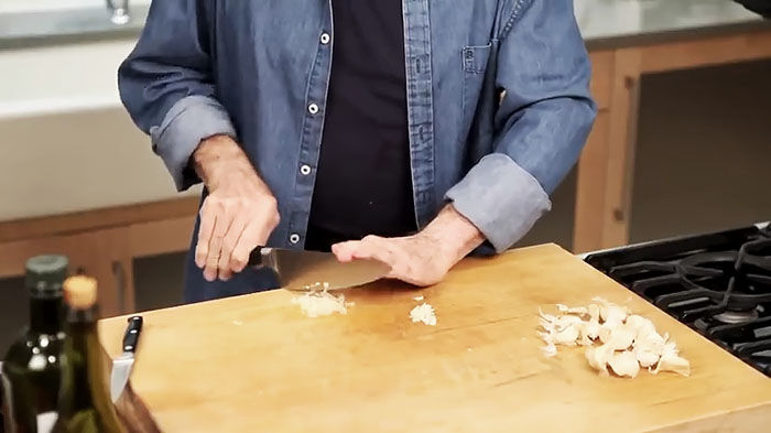 После каждого прохода сильно растирайте чеснок, собирайте его вместе и опять качающими движениями лезвия ножа нарезайте.