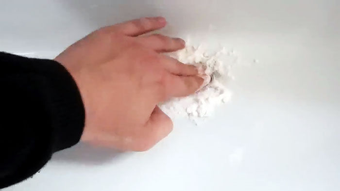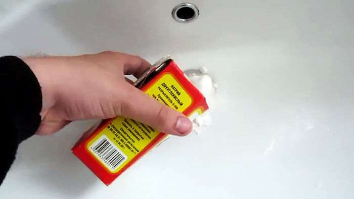 Насыпьте соду из пачки в сливное отверстие, пальцами как можно больше натолкайте ее внутрь, постарайтесь заполнить весь внутренний объем сифона.