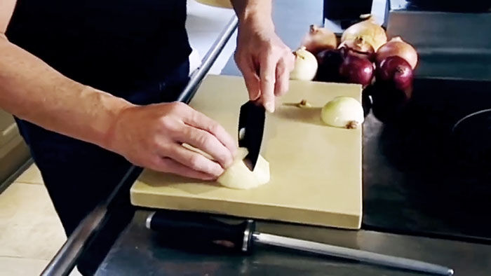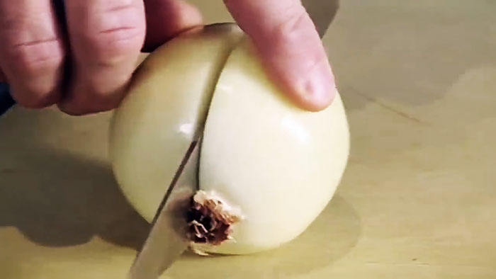 Правильно очищенную луковицу разрежьте на две равные половинки. Ее надо удерживать тремя пальцами, указательный держите немного спереди, большой и средний сзади.