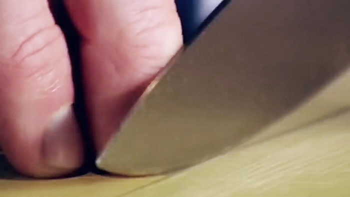Указательный палец надо согнуть таким образом, чтобы дистальная фаланга располагалась за плоскостью резания, острие ножа в перпендикулярном положении не должно к ней прикасаться, расстояние примерно 2–3 мм. Нож должен упираться о сустав между дистальной фалангой и средней фалангой.