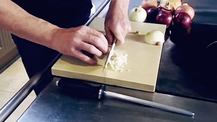 Опять сожмите луковицу и теперь нарезайте ее поперек волокон. Нож делает качающие движения. При этом лезвие должно касаться ногтя указательного пальца, а острие удалено от мягких тканей.