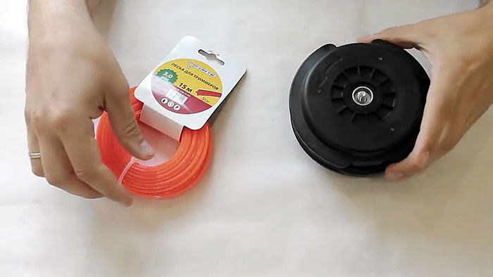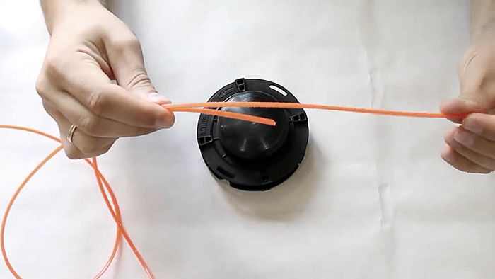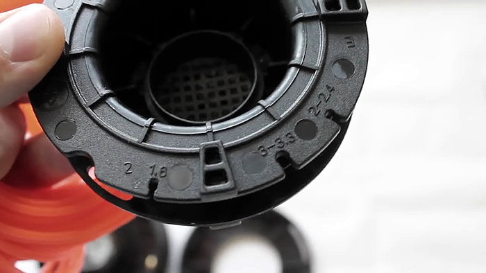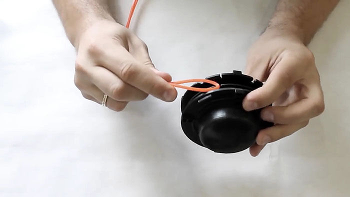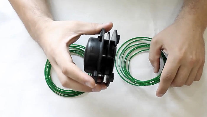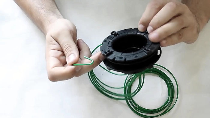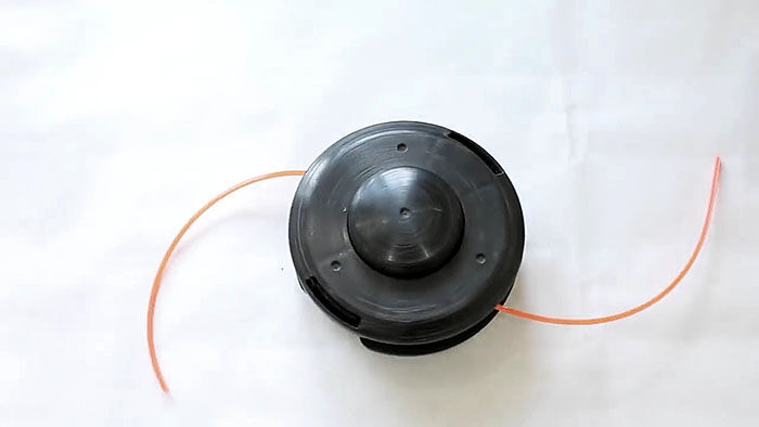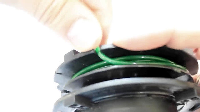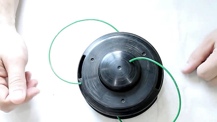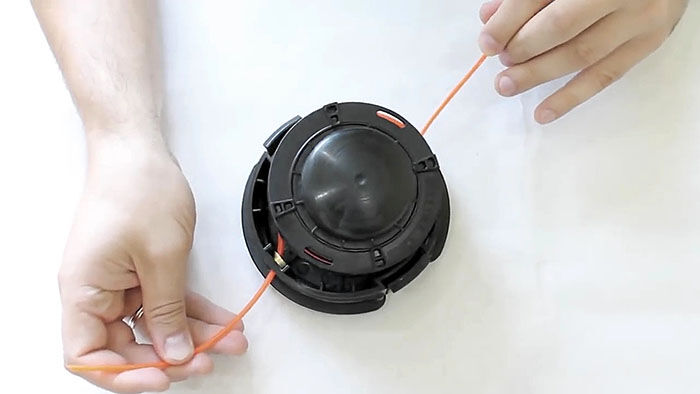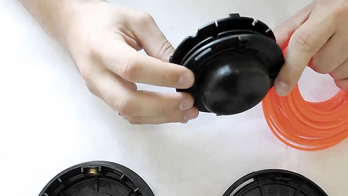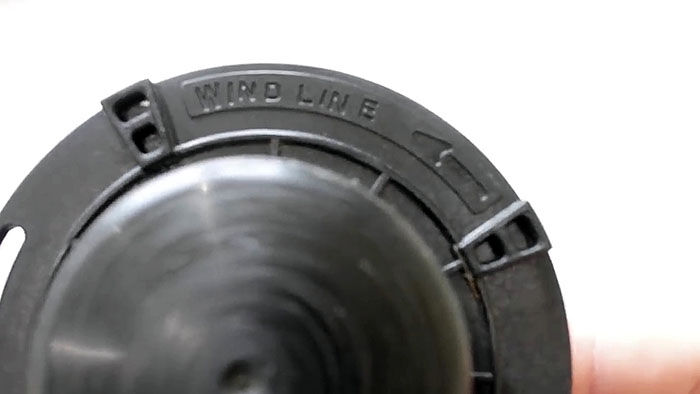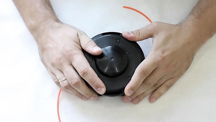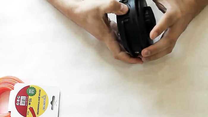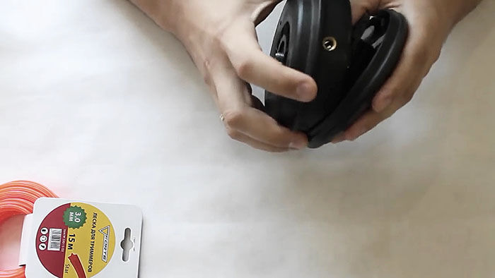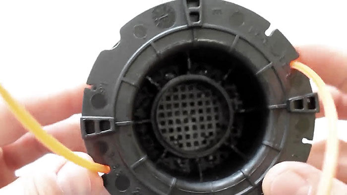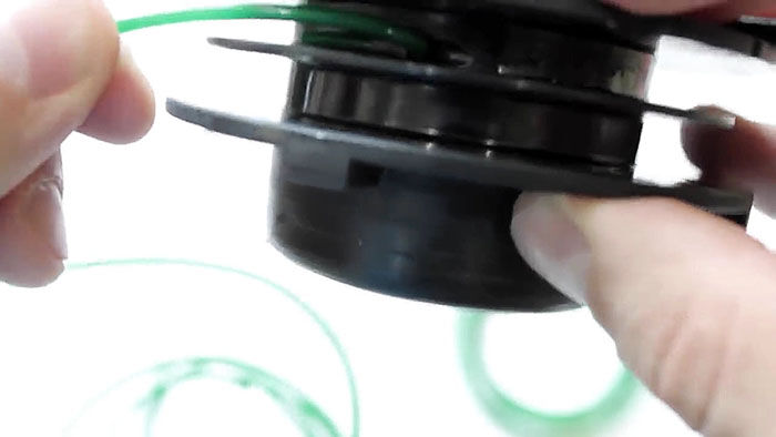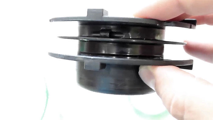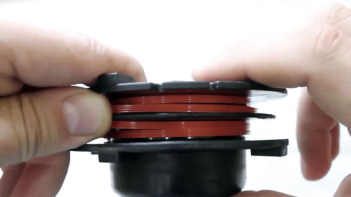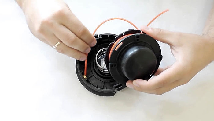 Теперь нужно вставить катушку в основу с пружиной. При этом концы лески продеваются в отверстия в косильной головке. Они подтягиваются, чтобы освободиться из захвата прорезей на катушке. После ставится крышка и головка готова к использованию.
