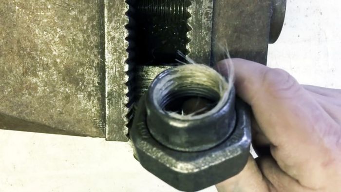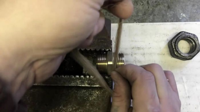 После притирки резьбы нужно взять пучок льна. В идеале, чтобы пакля была чистой без соломы. Ее количество берется в расчете на глубину резьбы. Чем выше диаметр соединяемых элементов, тем больше потребуется пакли.