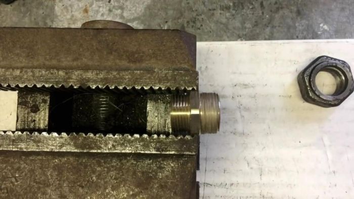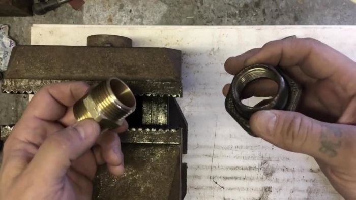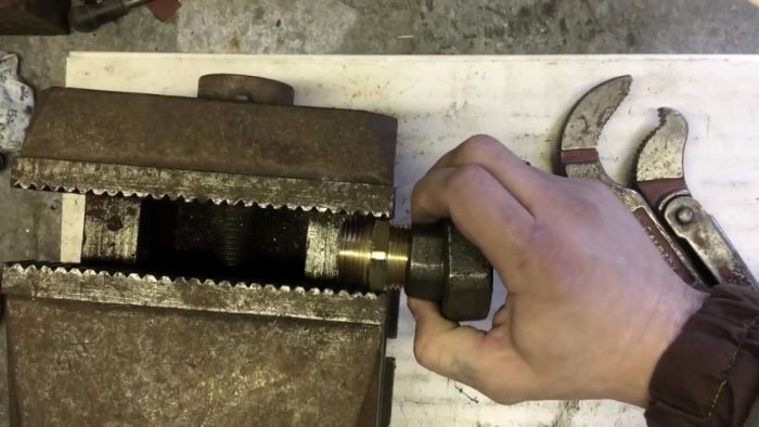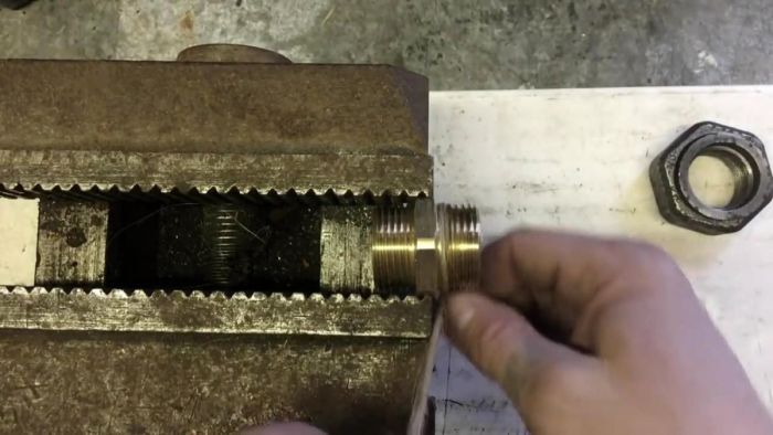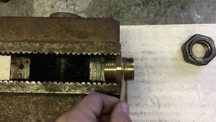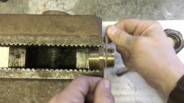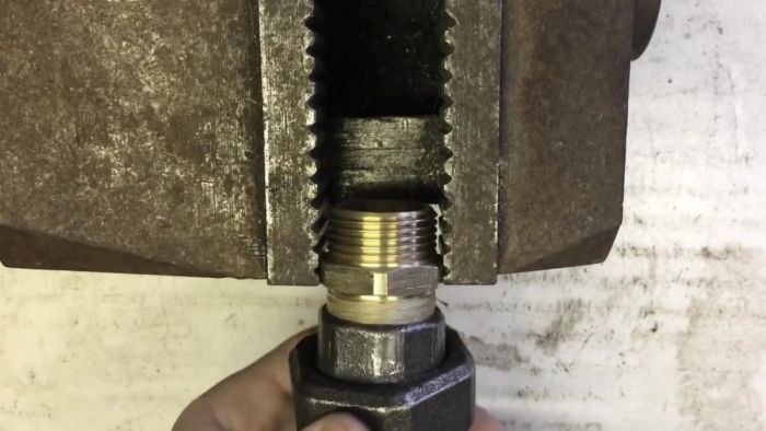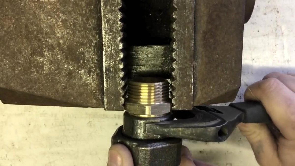 Цель использования льна заключается в плотной закупорке пространства между наружной и внутренней резьбой двух соединяемых элементов. Если его намотать сразу без подготовки, то в дальнейшем закручивать фитинги будет сложно. Нужно сначала их прогнать на сухую, чтобы резьбы притерлись. Если приходится работать с разными материалами, к примеру, латунным бочонком и чугунной американкой для циркуляционного насоса, то накрутить соединение вручную просто невозможно. В этом случае бочонок удобно зафиксировать в тисках, а если их нет, то подойдет газовый ключ. Соединение нужно прогнать до конца несколько раз, чтобы оно стало накручиваться и скручиваться руками.
