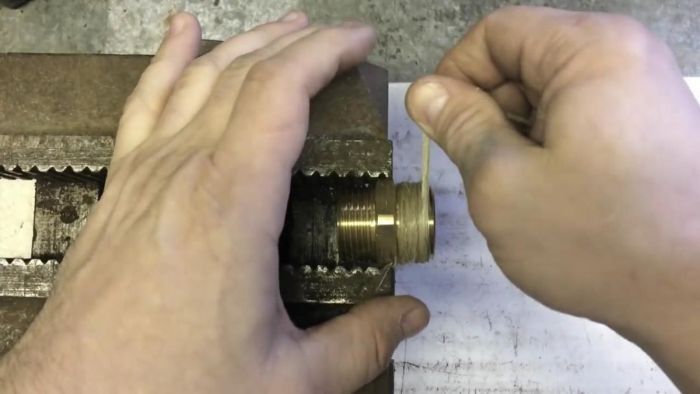 Делать это нужно таким образом, чтобы лен был сложен вдвое с небольшим хвостиком. Его петля накидывается на резьбу от себя. Хвостик наматывается против часовой стрелки.