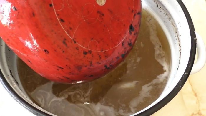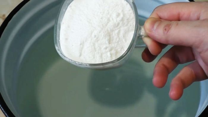 Возьмите чистую эмалированную кастрюлю объемом примерно 10 литров, на 2/3 долейте горячую воду и добавьте пищевую соду. Масса соды примерно 180 гр., можно пользоваться для мерки обыкновенными чайными стаканчиками.
