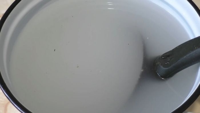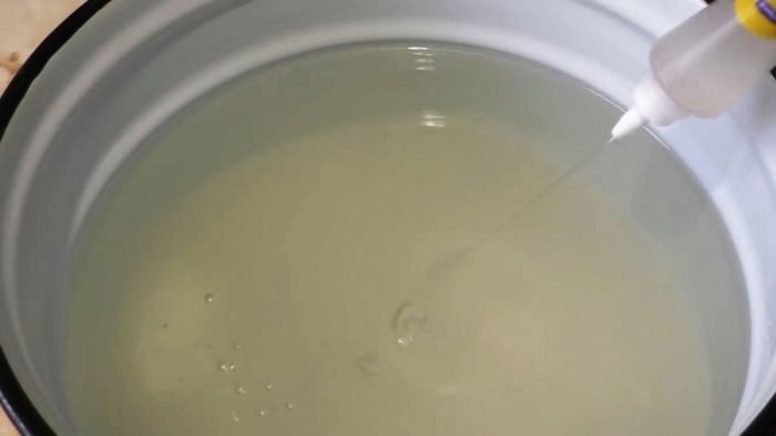 Небольшими порциями добавляйте в воду силикатный клей, при этом жидкость постоянно перемешивайте деревянной ложечкой. Мешать надо до полного растворения ингредиентов.