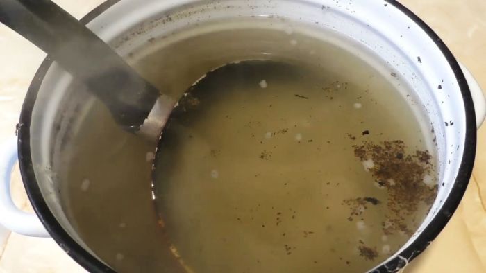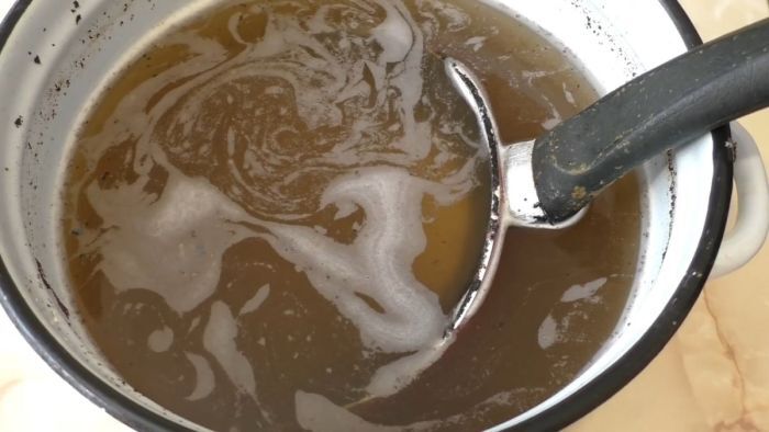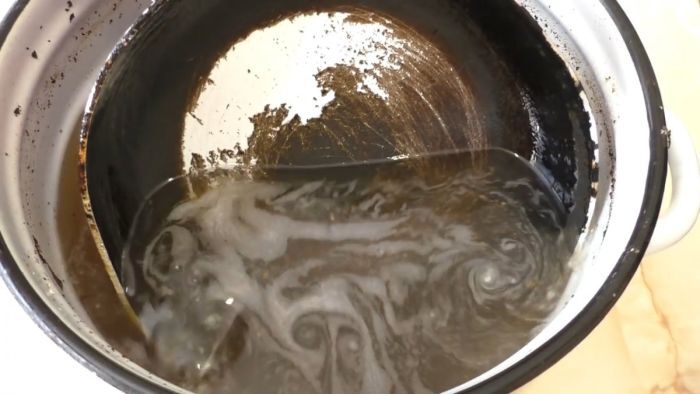 Поставьте емкость на огонь и доведите до кипения. Можно пять минут кипятить, чем больше – тем лучше. Приготовленное средство начинает работать сразу после контакта с грязной поверхностью сковороды, но для очистки еще требуются усилия.