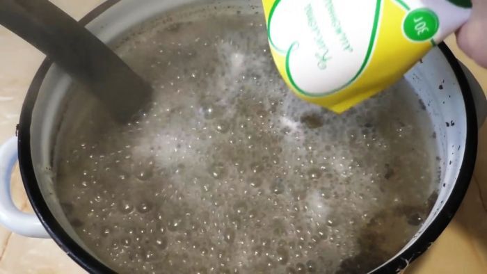 Снимите кастрюлю с плиты и добавьте упаковку лимонной кислоты весом 30 грамм, опять тщательно перемешайте жидкость.