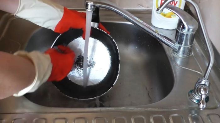 Поставьте сковороду в мойку под проточную воду и закончите процесс очистки. Работайте металлической щеткой, постоянно добавляйте пищевую соду.
