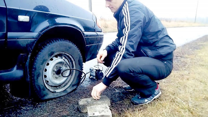Накачиваем колесо насосом до максимально приближенного к нормальному состояния.