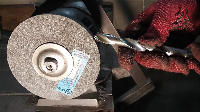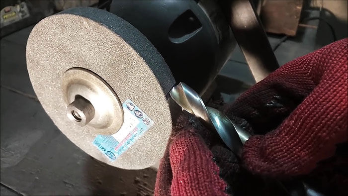 Берем побывавшее в работе сверло, со сбитыми режущими кромками и попробуем его заточить. Находим правильное положение инструмента в пространстве, начинаем заточку.