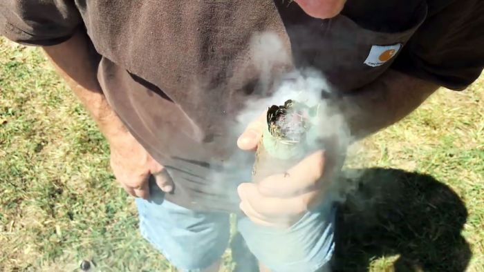 Берем бутылку (кстати пластиковая тоже годится) и заполняем ее чистой водой. Затем как линзой лупу ловим солнечный свет, пытаясь сфокусировать концентрированную световую точку на сухой траве. Это нужно делать в районе горлышка, так как оно имеет округлую форму.