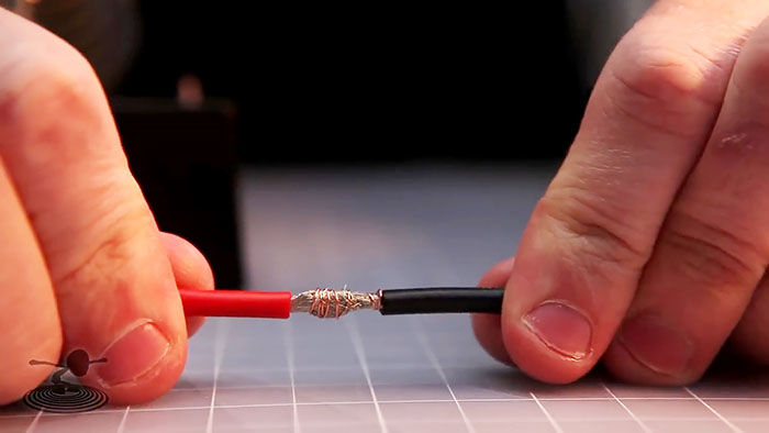 Обмотку следует проводить со средней частотой. Если укладывать виток к витку, то получится аккуратней и прочней. При наматывании проволоку следует натягивать, по завершению ее концы соединяются скруткой или заводятся в жилы. Полученный в результате бандаж нужно окончательно затянуть. Для этого соединенные провода растягиваются. Чем сильнее их тянуть, тем больше жилы сжимаются бандажом. В результате соединение станет не менее стойким к разрыву, чем цельный кабель.