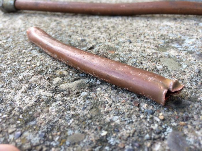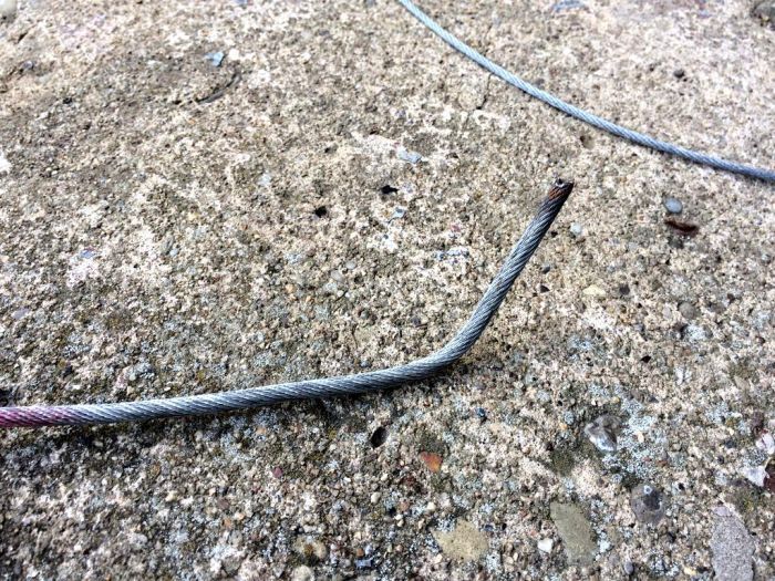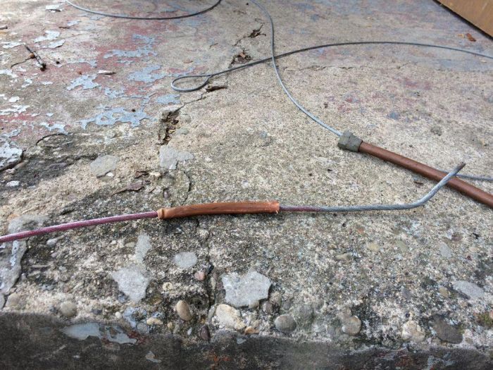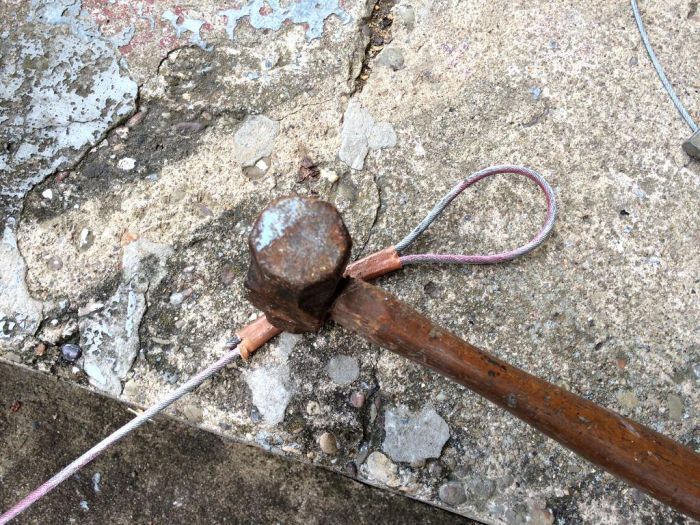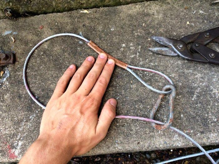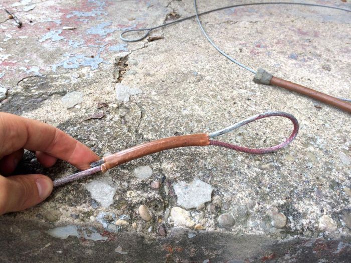 Первым делом нужно подобрать трубку из меди, латуни или алюминия. Хватит длины 15-20 см, но не меньше, поскольку это снизит надежность. Важно, чтобы ее внутренний диаметр позволял внатяжку продеть сложенный вдвое трос. Если тот не помещается, то трубку можно немного вдавить молотком по длине. Овальное сечение даст больше места. Трубка фиксируется на сложенном вдвое тросе так, чтобы получить петлю требуемого размера.