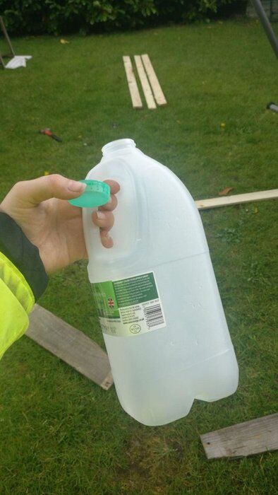 Чтобы при выливании воды канистра не деформировалась, а жидкость вытекала быстро, в лейку должен поступать воздух предотвращающий вакуум. Для этого в ручке у горловины нужно сделать одно отверстие все тем же сверлом или гвоздем. После заправки лейка готова к применению.