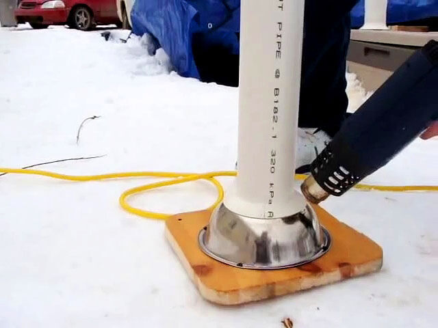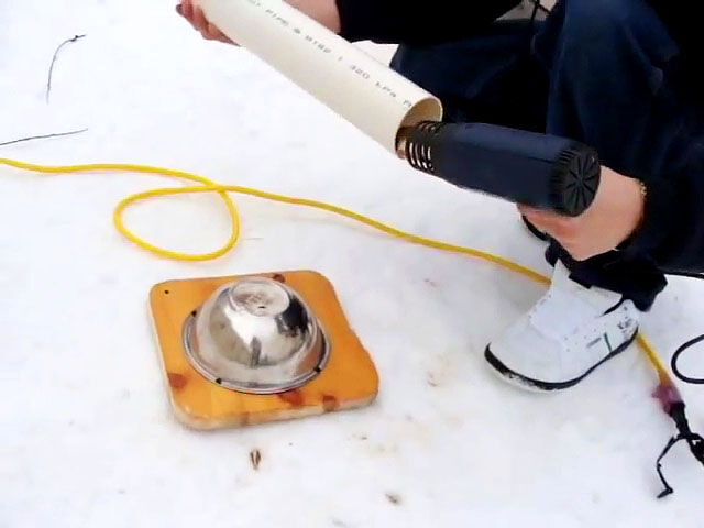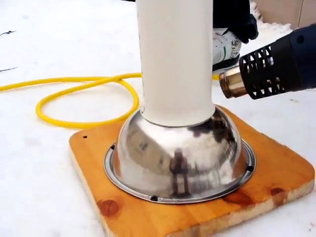 Далее ставим на чашу и продолжаем равномерный прогрев как трубы так и чаши. Постоянно вращаем трубу для большей равномерности прогрева и немного надавливаем на нее чтобы пластик расползался по форме.