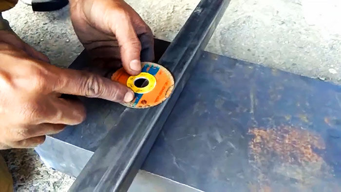 К точке ее пересечения с гранью изделия прикладываем старый отрезной диск, у которого диаметр совпадал бы с линией сопряжения двух сторон трубы, а верхняя его точка лежала бы на противоположной грани изделия.