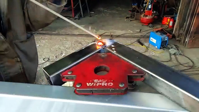 Используя магнитный угольник, завариваем все линии стыка, прочно и надежно фиксируя полученный плавный изгиб.