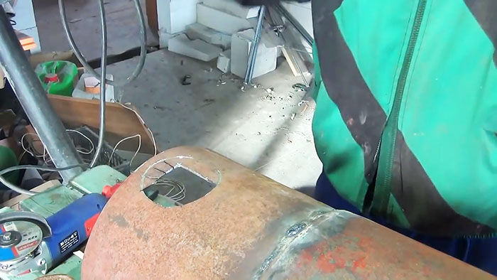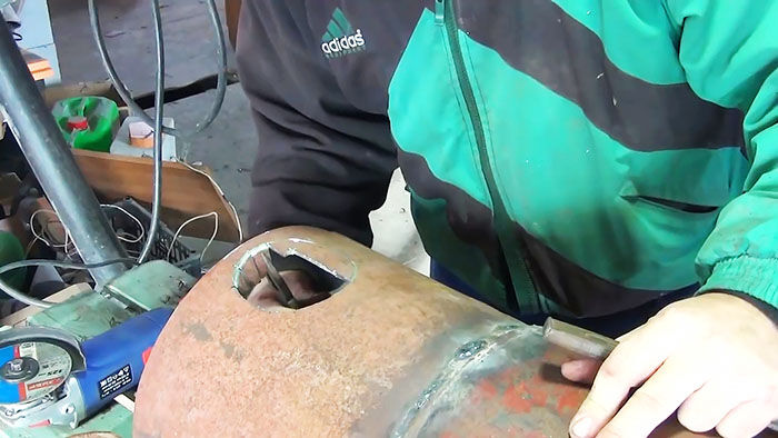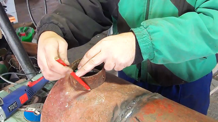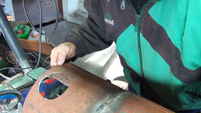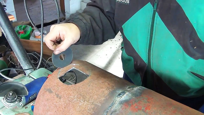Теперь нужно удалить оставшуюся часть металла между контуром круглого отверстия и границей вырезанного в нем квадрата. Для этого болгаркой лишняя сталь распускается на сектора шириной в 1-1,5 см. Если металл толстый, то делая надрезы лучше соблюдать малый шаг.