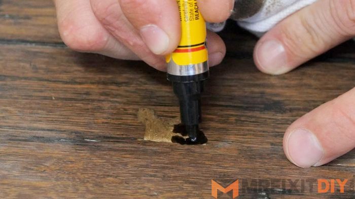 Скрыть неглубокие царапины очень просто. Для этого достаточно подобрать специальный перманентный ремонтный маркер подходящего оттенка. Им нужно поводить по царапине, закрасив ее волокна, после чего стереть излишки чернил салфеткой.