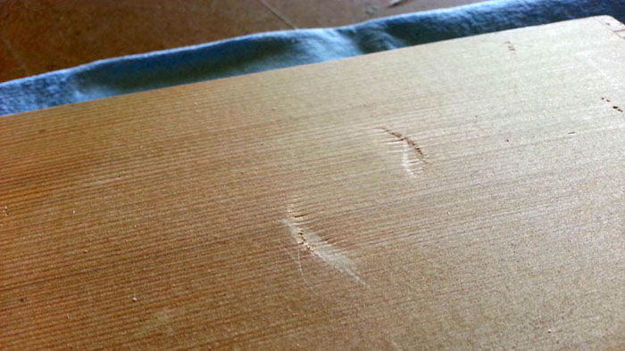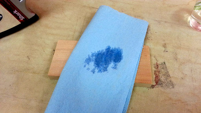 2. Накрываем участок деревянной поверхности с вмятиной куском ткани в один или два слоя в зависимости от ее толщины, и выжидаем несколько секунд, чтобы вода полностью впиталась в ткань.