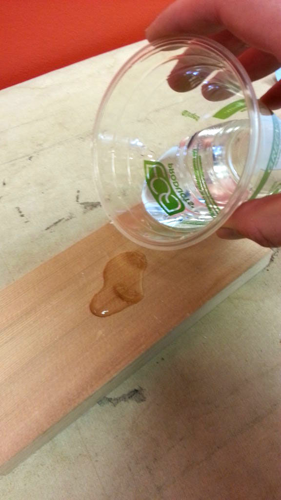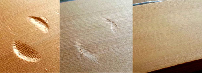5. После этого убираем ткань и убеждаемся, что вмятина исчезла. Это произошло из-за того, что поврежденные и деформированные древесные волокна впитали горячую воду и под ее воздействием расширились и приобрели прежний объем (форму).