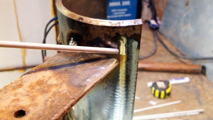 Зачищаем поверхность толстостенной трубы до блестящего металла и прихватываем прямоугольный профиль к трубе. Варить лучше электродами АК-53-70 или АК-46 с основным или рутиловым покрытием.