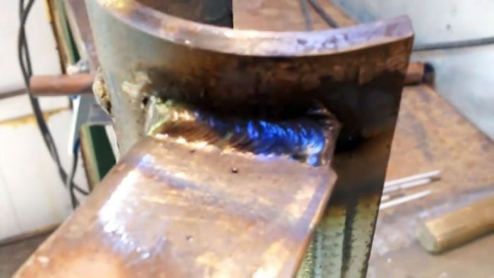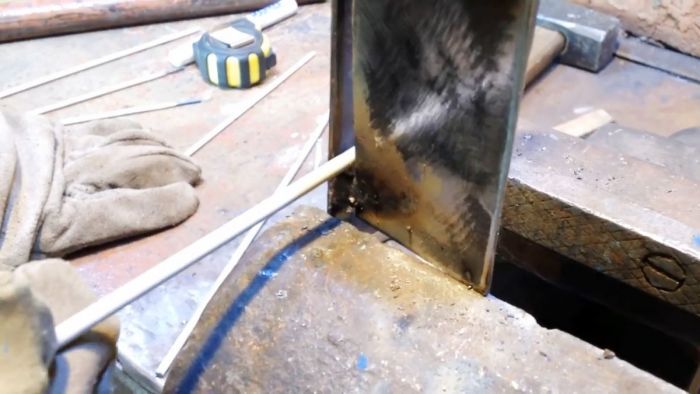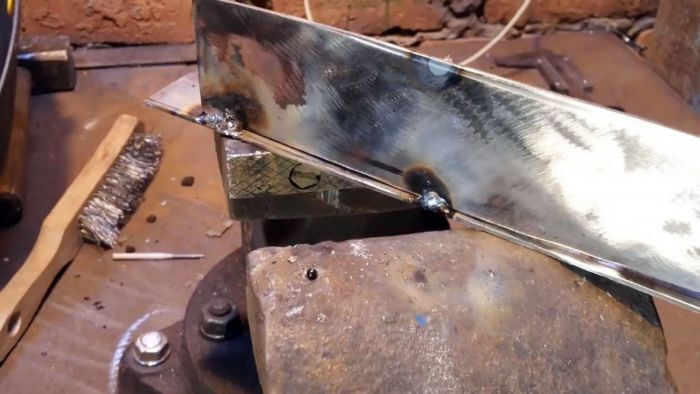 Наложив сварочный шов с одной стороны профиля, отбиваем с помощью молотка образовавшийся при сварке шлак и зачищаем его металлической щеткой.