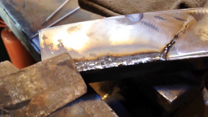 В этом случае электрод с зажженной дугой держим на толстом металле несколько дольше, чтобы образовалось побольше жидкого металла и только после двигаем электрод поперечно в сторону тонкого металла. Также после завершения сварки отбиваем шлак и чистим шов.